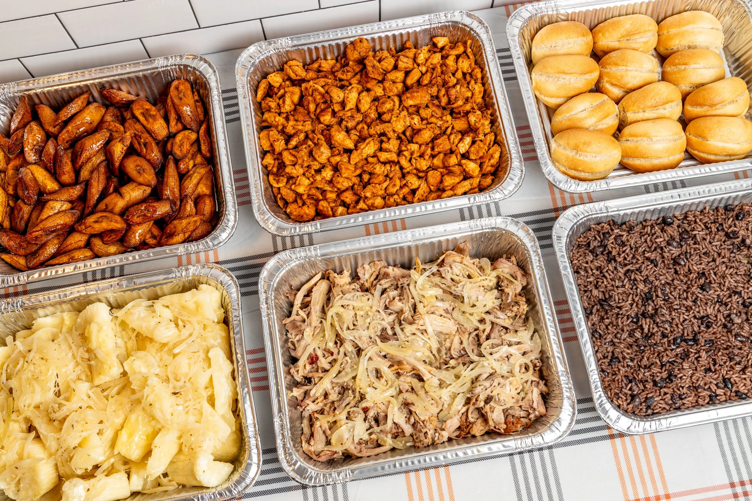 Includes a Whole Roasted Pork Shoulder (can order shredded if prefer), Yuca with Mojo, Cuban Moros Rice and Sweet Plantains